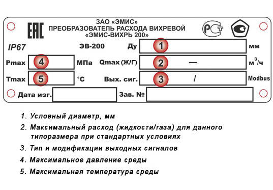Пример обозначения преобразователя ЭМИС-ВИХРЬ 200-ЕхВ-050-А–Ж-Н-Ф1-Д-2,5-250-СИМ-В-Н–ГП