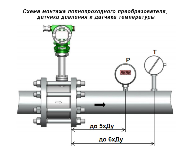 Для преобразователей с диаметром условного прохода менее 50 мм датчики давления и температуры допускается устанавливать на расстоянии до 10хДу после преобразователя в расширении трубопровода, датчик также допускается устанавливать перед преобразователем на расстоянии 5...10хДу.