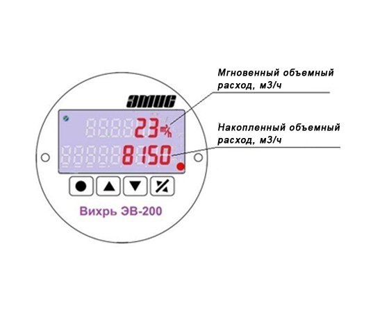 При включении прибора на дисплее по умолчанию доступны параметры мгновенного объемного расхода (м3/ч) и накопленного объемного расхода (м3/ч). Со структурой меню расходомера и параметрами, отображаемыми на индикаторе можно подробно ознакомиться в Руководстве по эксплуатации (приложение Б, рис. Б.4 и рис. Б.5, таблица Б.1 стр. 55-56).